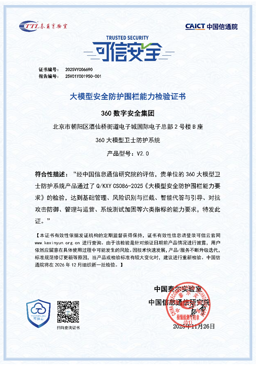 此次360首家通过信通院大模型安全防护围栏能力测评,不仅是对其技术实力与产品成熟度的权威认可,也彰显了其在AI安全领域的持续积累与前瞻布局。未来,360将持续深耕大模型安全技术,携手行业伙伴共建可信AI生态,为人工智能的稳健发展筑牢安全底座。