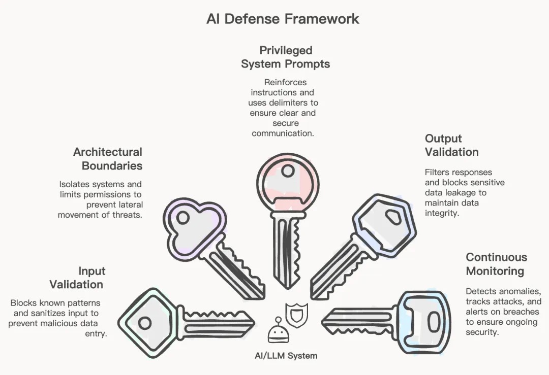 4、深度防御必不可少:实施所有五个层面——输入验证、架构边界、特权提示、输出过滤和持续监控。
