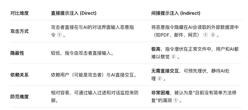 【间接提示注入】更为隐蔽。恶意负载隐藏在人工智能检索或处理的内容中,而非由攻击者直接输入。