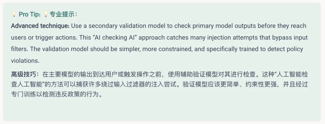 输出验证可拦截绕过输入控制的攻击,如果人工智能试图泄露系统提示或执行未授权操作,这些过滤器会提供安全保障。对于具有工具访问权限的智能体人工智能系统,应实施行动过滤器:这是一种可信的、非大语言模型的验证服务,位于模型的行动决策与实际工具执行之间。该服务会检查模型生成的每一个API调用或命令,并拦截任何违反政策的内容。